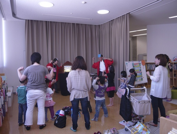 今日のお話会は、手遊びからスタートです。お母さんも一緒に元気よく「イチ、ニ、サン、、、、」