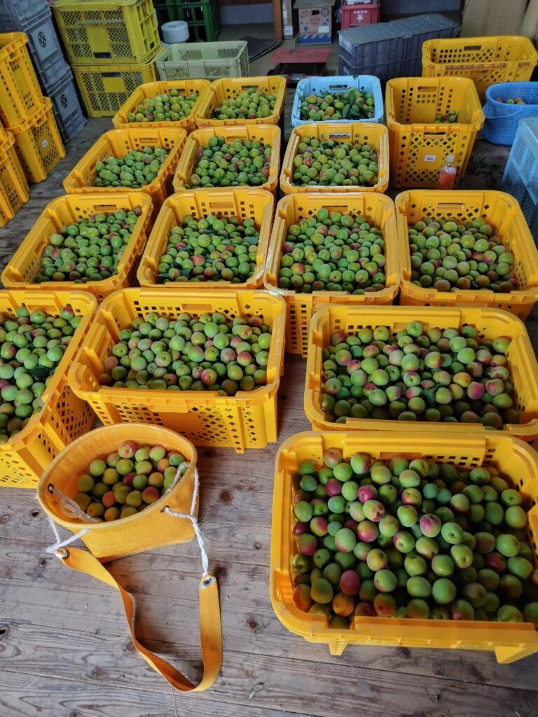 昨日約一か月かかりましたが、畑の梅収穫作業終了しました。大勢の人にご協力頂き、何とか収穫、選果、出荷、配達を終えることが出来大変感謝しております。今年は全体としてはまあまあでしたが、南高梅の収穫量が期待したよりも少なく、すべての受注にこたえられず一部のお客様にはご迷惑をおかけし申し訳ありませんでした。改善点が明らかになり、対策の方向がみえてきました。改めてご協力頂きました皆様に感謝申し上げます!