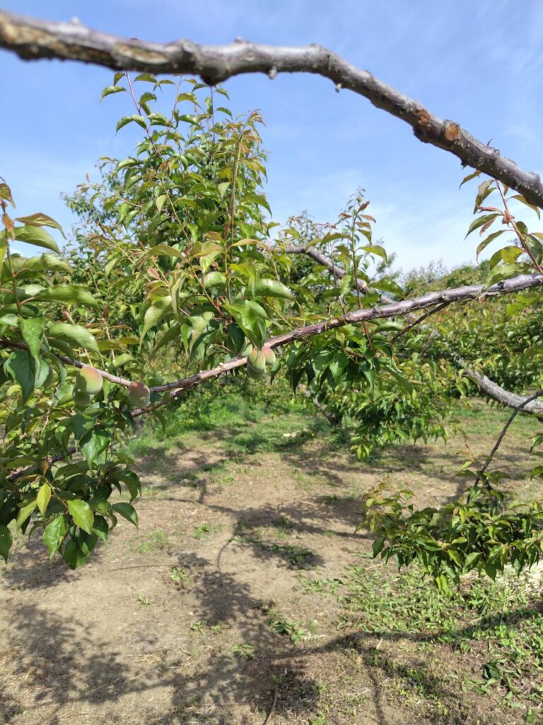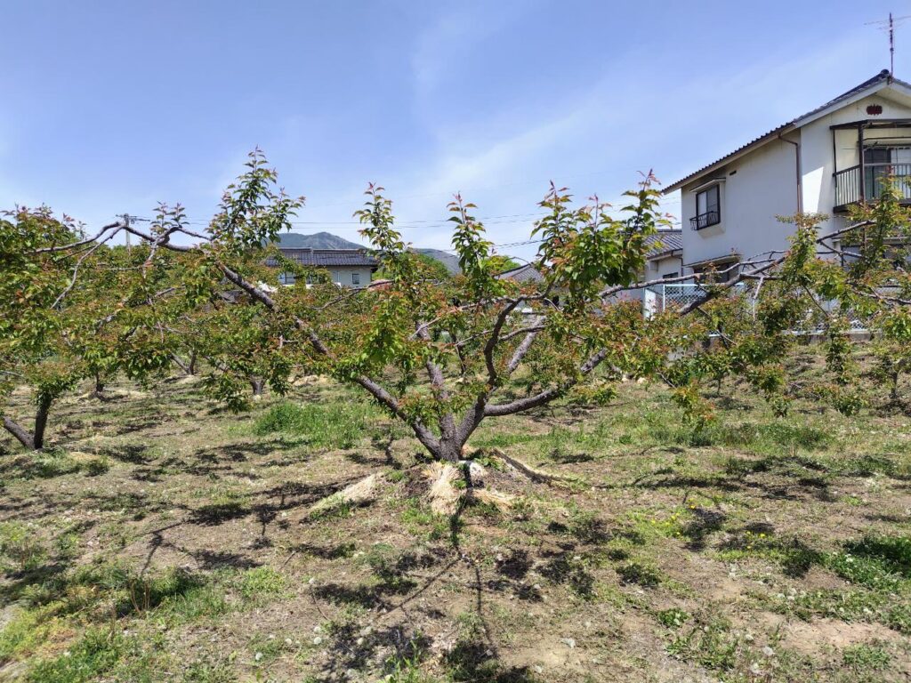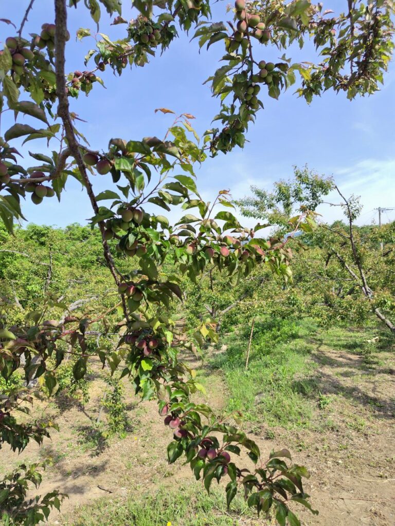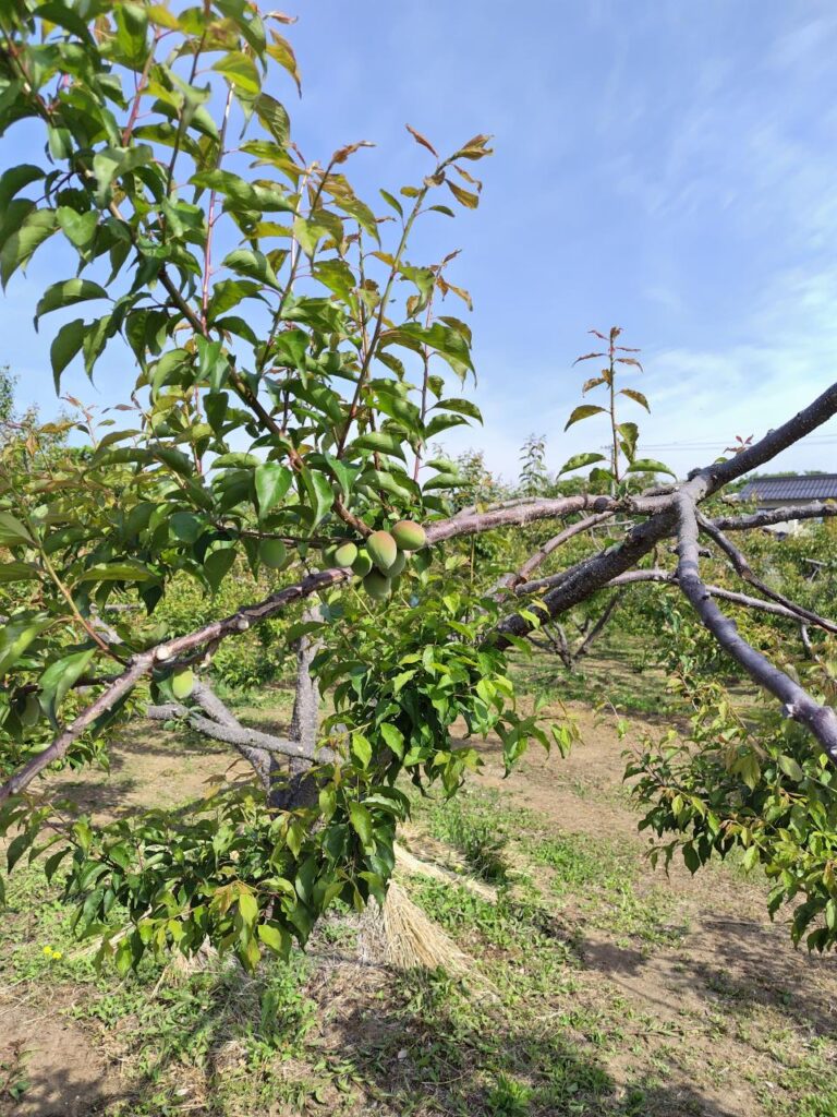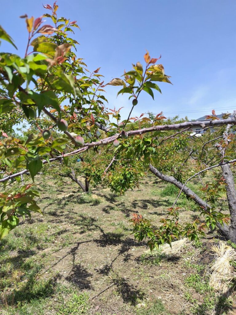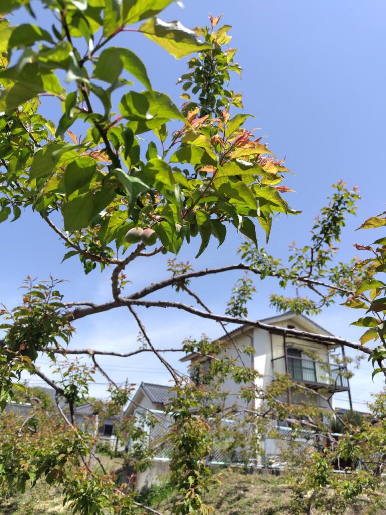 気持ち良い青空(五月晴れ)の下畑を見回ると小さな実が膨らんでいます。防虫防菌の消毒、施肥及び草刈りをしながら見ていると、次第に小さな実が膨らんで大きくなり目立つようになってきました。順調なようです。昨年のような不作とはならず期待できます。